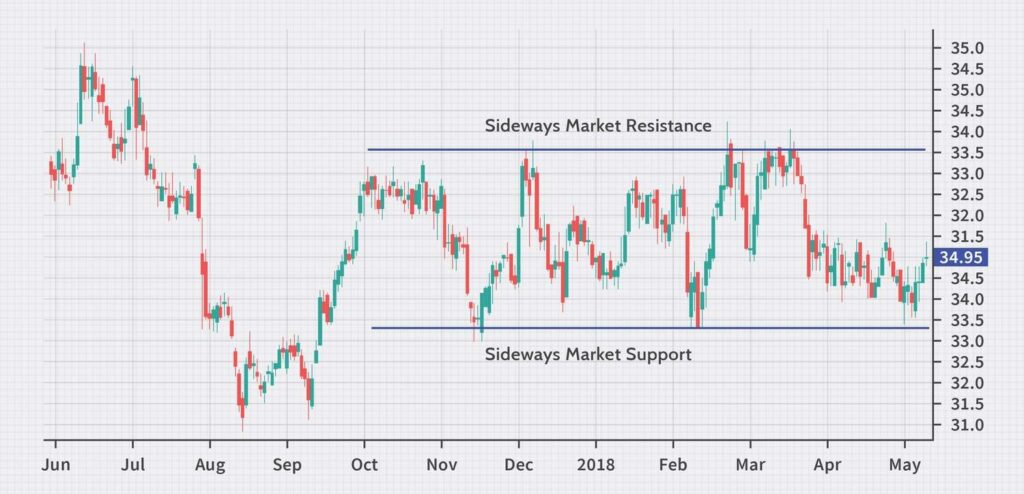 A sideways market in trading happens when the price of a stock or asset moves within a narrow range, without going clearly up or down. In other words, it means the market has no strong trend, and prices stay stable for a period. As a result, traders often wait for a clear direction before making big moves.